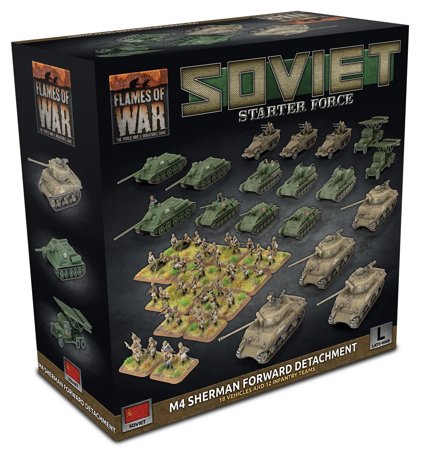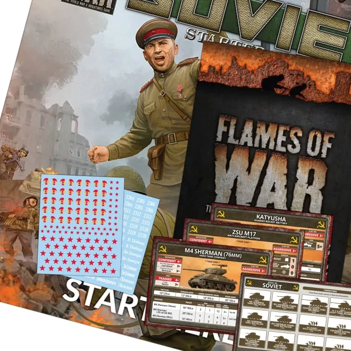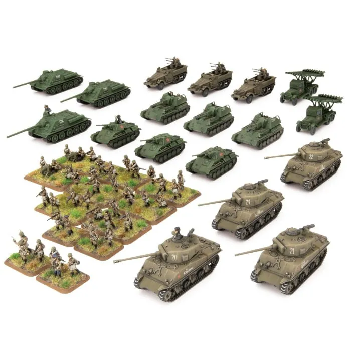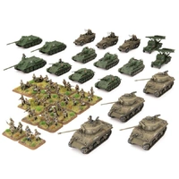 Machine-gun fire streamed from the windows of the apartment building, rounds clattering against the steel hide of the Sherman. Semyon winced at the muffled impacts, swivelling his head about in the cupola, trying to locate the MG. On either side of the tank, the submachine-gunners, all veterans, took cover, returning fire while they waited for the Sherman to knock out the gun. The flashes drew his eyes to an upper window, where a pair of helmets bobbed, their wearers working a machine-gun back and forth, raking the street below. “There he is! Gunner, fourth floor, on the right!” He yelled, the gun elevating in response as Petrov brought his own gunsight onto the target. The 76mm flashed to life, the shell finding its mark and the upper façade of the apartment exploded, raining debris. Semyon cheered. The infantry, now freed of the suppressive fire, began to advance once more. Semyon's reverie was shattered by a rocket shrieking past the tank and slamming into a wall on the other side of the street. “Panzerfaust!” someone screamed. Semyon blinked away the sweat and scanned the street, his earlier celebration replaced by fear that a second rocket might be more accurate than the first. “There!” In a doorway crouched a German, a discarded panzerfaust at his feet, another in his hands. “He’s on the right!” Semyon cried, the turret moving in response, Petrov bringing the gun to bear on this new threat. Suddenly the Sherman rocked again, the turret skewing to one side as it suddenly reversed, the hull machine-gun spitting death at the enemy tank-hunter. “Quick thinking Dmitry” Semyon gasped, letting out a tense sigh. Moments later the Sherman was moving once more, cautiously inching forwards, the crew alert, acutely aware of the perils of overconfidence. THIS PRODUCT CONTAINS: 1x Motor Rifle Forward Detachment HQ 1x Guards Hero Motor Rifle Company 4x M4 Sherman (76mm) Tanks 3x T-70 (45mm) Tanks 3x SU-76 (76mm) Assault Guns 3x ZSU M17 Self-Propelled Anti-aircraft 3x SU-100 (100mm) Assault Guns 2x Katyusha Rocket Launchers Complete A5 Flames Of War rulebook 1x Soviet "Start Here" Guide 2x Decal Sheets 10x Unit Cards --- These miniatures are supplied unassembled and unpainted