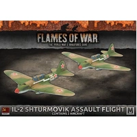 Flames of War's IL-2 Shturmovik Assault Flight Package Contents: - 2 Resin and Metal Il-2 Shturmovik Aircraft - 2 Plastic Flight Stands - 1 Decal Sheet - 1 Unit Card Package Info: The Ilyushin-2 Shturmovik ground-attack aircraft was one of the most important Soviet combat aircraft of World War II. The Il-2 was a well-designed, effective aircraft and was produced in great numbers. - Product is for use in the Flames of War Miniature tabletop game. - Models are supplied unpainted and require assembly. - Any additional scenery shown, models, paint, or glue not included. Product Part Number: SBX53 Flames of War Unit's Country: Soviet