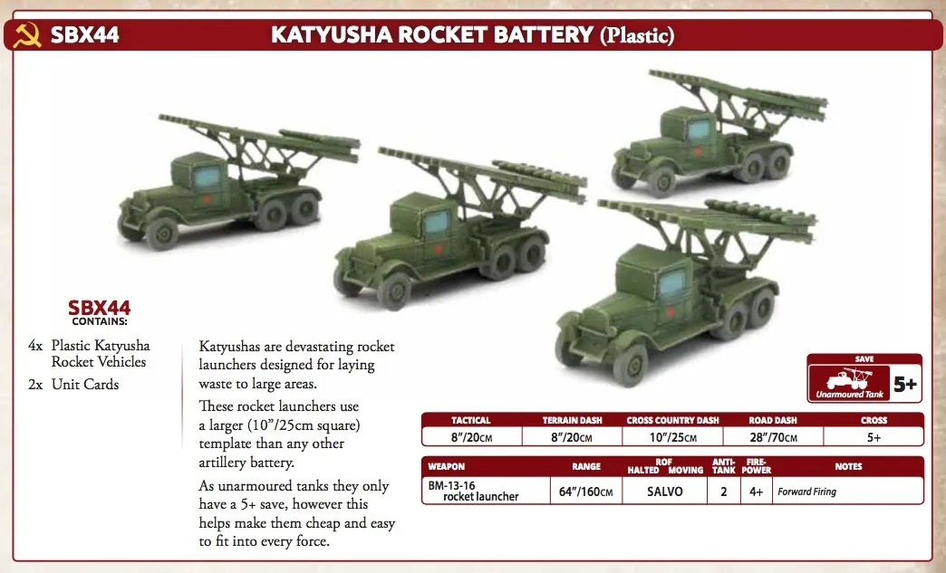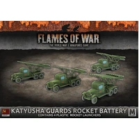 Flames of War's Katyusha Guards Rocket Battery Package Contents: - 4 Plastic Katyusha Rocket Battery Vehicles - 2 Unit Cards Package Info: The Red Army was a world leader in the field of rocketry. They used truck-mounted salvo rocket launchers against the Germans right from the start of the war. These saturated a large area with explosives, quickly pinning down the enemy and causing widespread casualties. - Product is for use in the Flames of War Miniature tabletop game. - Models are supplied unpainted and require assembly. - Any additional scenery shown, models, paint, or glue not included. Product Part Number: SBX44 Flames of War Unit's Country: Soviet Flames of War Time Period: WWII