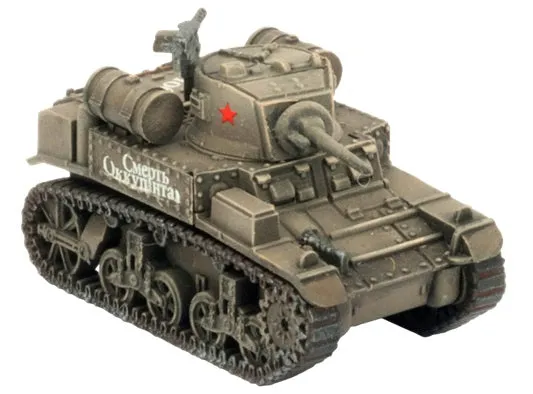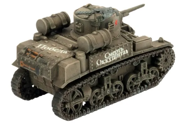 As a classic light tank, combining speed and light armour, the M3 Stuart fit in readily with the existing Soviet doctrine for exploiting breakthroughs. However, experience showed that the M3 Stuart's light armour was insufficient to allow it to operate alongside the well-armoured T-34 medium tank as an assault tank. THIS PRODUCT CONTAINS: 5x M3 Stuart Tanks 1x Decal Sheet --- These miniatures are supplied unassembled and unpainted
