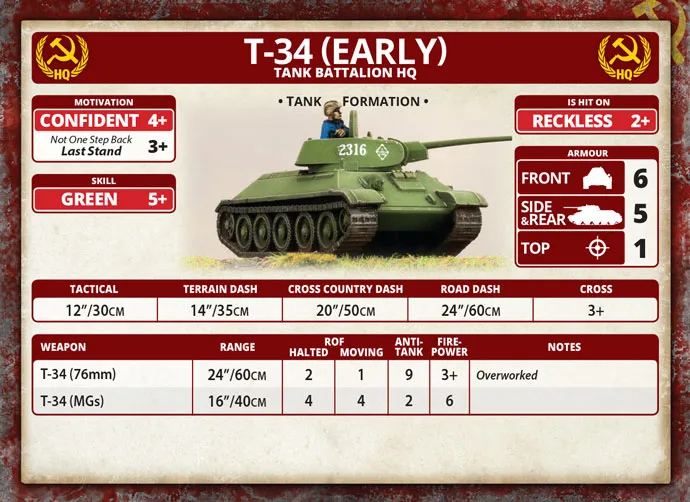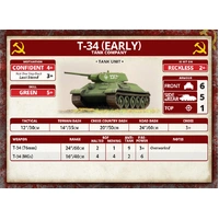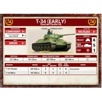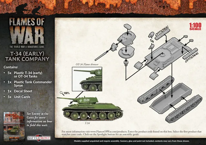 T-34 (Early) Tank Company (Plastic) (SBX39) includes five plastic T-34 (early) tanks, one plastic Tank Commander sprue, one Decal sheet and five Unit Cards. When their speedy, but lightly-armoured, tanks suffered heavy losses in the Spanish Civil War, the Soviet tank designers built a replacement with thicker armour and a bigger gun - the T-34. Entering production before the German invasion, this tank continued to fight throughout the war, becoming the most-produced tank of the Second World War. Lighter, faster, and cheaper than the KV-8, the OT-34 flame-tank mounted the ATO-41 flame-thrower in place of the hull machine-gun. Oddly, the flame-thrower was fired by the driver and relied more on its fearsome nature than accuracy for effect. The tank retained the 76mm gun of the line tanks, giving it the capability to operate as a gun tank if necessary. - Models are supplied unpainted and require assembly. - Any additional scenery shown, models, paint, or glue not included. ​