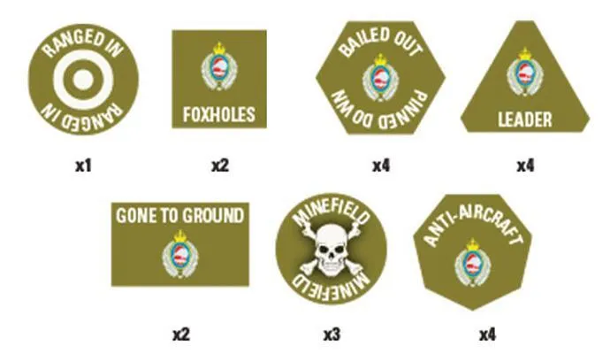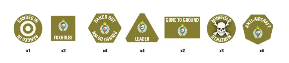 New Zealand ANZAC Token Set (VE011) includes 27 full-colour New Zealand ANZAC specific gaming tokens. The New Zealand ANZAC token set contains 27 full-colour gaming tokens including: 4x Bailed Out tokens; 4x Bogged Down tokens; 4x Dug In tokens; 4x Gone To Ground tokens; 4x Pinned Down tokens; 1x Ranged In tokens; 2x Reorganising tokens; 2x At The Double tokens; 2x Non-Assaulting Team tokens.