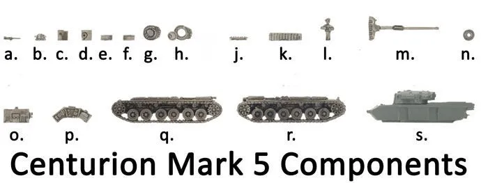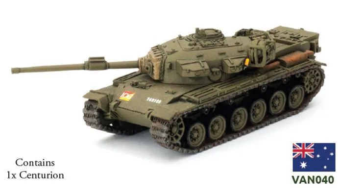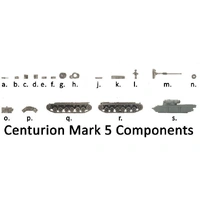 Flames of War Nam ANZAC Centurion FOW VAN040 includes one Centurion Mk 5 tank Of the many nicknames that the tankies of the 1st Armoured Regiment acquired from the infantry, the most unkind was probably ‘koalas’ (a reference to koalas being a protected species, not to be sent overseas, and not to be shot at), a reference to them not being sent to Vietnam until 1968. The ‘turret heads’ dealt with that nickname in their first battle, and after that the infantry requested tank support whenever contact with the enemy was expected. The regiment’s flag bears the colours brown, red, and green, based on the Royal Tank Regiment’s motto: ‘From Mud, Through Blood to the Green Fields Beyond.’ They certainly found plenty of mud and more than enough blood in Vietnam, although their losses during their rigorous training were higher than their losses in Vietnam itself. Description of Components a. .30 cal AA MGs. b. Loader turret hatch. c. Right-hand side rear mudguard. d. Left-hand side rear mudguard. e. Right-hand side front mudguard. f. Left-hand side front mudguard. g. Closed turret cupola. h. Open turret cupola. j. .30 cal ammunition can stowage piece k. Jerry can stowage piece. l. Tank commander figure. m. Main gun. n. 2x Spare road wheels. o. Additional fuel tank. p. Turret stowage rack. q. Left-hand side track r. Right-hand side track. s. Resin hulls & turret. Designed by Tim Adcock Painted by James Brown Miniature is supplied unpainted and requires assembly *not in retail packaging, we buy direct from Battlefront but the vietnam line, many items come in a generic plastic container or regular box.