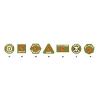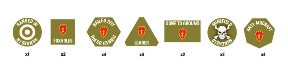 Tropic Lightning Token Set (VE005) includes 27 full-colour 25th Infantry Division specific gaming tokens. The Tropic Lightning token set contains 27 full-colour gaming tokens including: 4x Bailed Out tokens; 4x Bogged Down tokens; 4x Dug In tokens; 4x Gone To Ground tokens; 4x Pinned Down tokens; 1x Ranged In tokens; 2x Reorganising tokens; 2x At The Double tokens; 2x Non-Assaulting Team tokens.