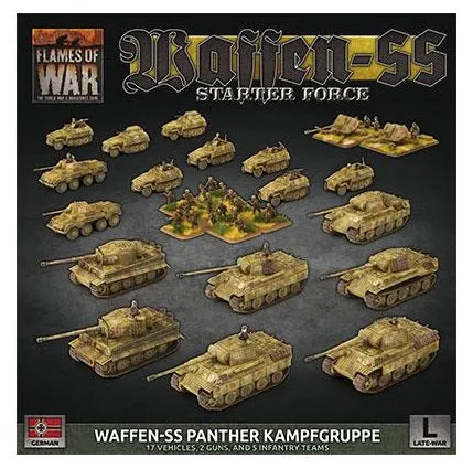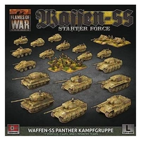 Waffen-SS Panther Kampfgruppe (Plastic) (GEAB19) The SS panzer divisions were all-arms forces, with an armoured group of tanks and armoured infantry mounted in halftracks, infantry groups fighting on foot, and a reconnaissance group of armoured cars and panzergrenadiers in light halftracks that was often used as the divisional reserve. These elite troops stopped attack after attack, fighting with fanatical determination against great odds. German Waffen-SS Panther Kampfgruppe includes: • Five Panther (7.5cm) tanks • Two Tiger (8.8cm) tanks • One SS Panzergrenadier Platoon • Two Puma (5cm) Armoured Cars • Six Sd Kfz 250 (MG) Half-tracks • Two 8.8cm Guns • Complete A5 Flames Of War rulebook • One Waffen-SS "Start Here" Guide • Two Decal Sheets • Ten Unit cards. The units in the German Waffen-SS Panther Kampfgruppe have a combined points value of 85 points . Models come unpainted. Assembly required. Glue, paints, and hobby supplies sold separately.