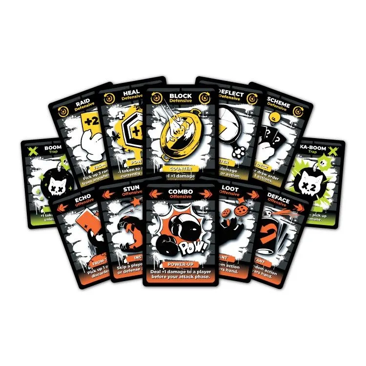 Don the cloak of one of these random crafty characters, each with its own unique play style and disruptive ability. Take turns attacking your opponents and strategically wield the array of action cards at your disposal. With each successful hit, send skull tokens flying left and right until opponents inevitably fall.
