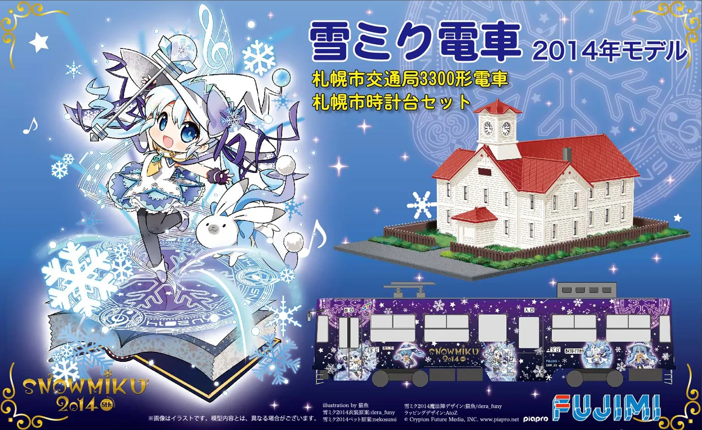 This is a scale plastic model kit, assembly required. Paints and glue not included. This is the 1/150-scale Snow Miku Train 2014 unassembled model kit produced by Fujimi. Snow Miku is the character from the Sapporo Snow Festival held annually in Hokkaido, since 2010. The body is painted, and the "Sapporo Clock Tower" kit is also included! Specifications - Item Size: 26 x 16 x 4.5 cm