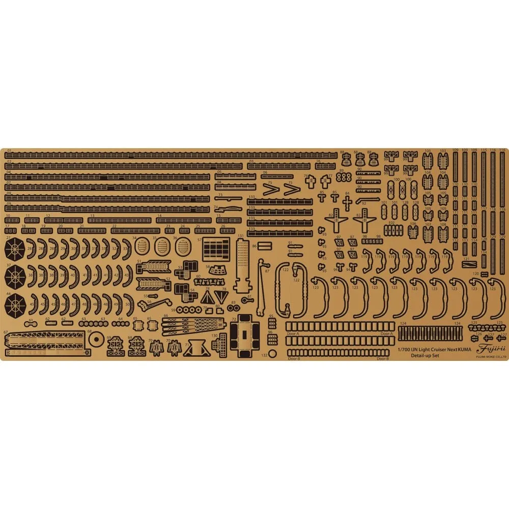 Etching parts collection to further upgrade the Ship NEXT series Light Cruiser Kuma is now available in a new design! Features - This product is compatible with the 1/700 Ship NEXT Series No.017 IJN Light Cruiser Kuma. - Contains over 130 different parts for one ship. - The parts are compiled on one large size etching sheet. - Etched parts are 0.15mm thick for both moderate strength and bendability. - More than 130 types of parts, more than 400 items, are included. Contents - Etching parts x1 - Instruction manual x2