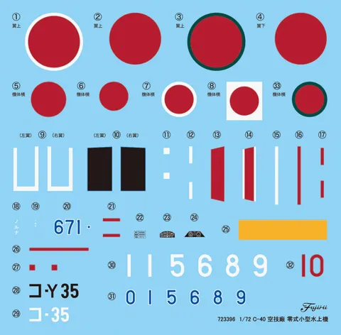 Decals are included in sets of two, and include the aircraft numbers (separate numerals) of the Sixth Fleet Affiliated Squadron and the prototype's Naval Aviation Technical Arsenal, the aircraft's Hinomaru mark, and the cockpit instrument panel. The instruction manual has been completely redesigned, with a decal combination chart and painting instructions clearly explained.