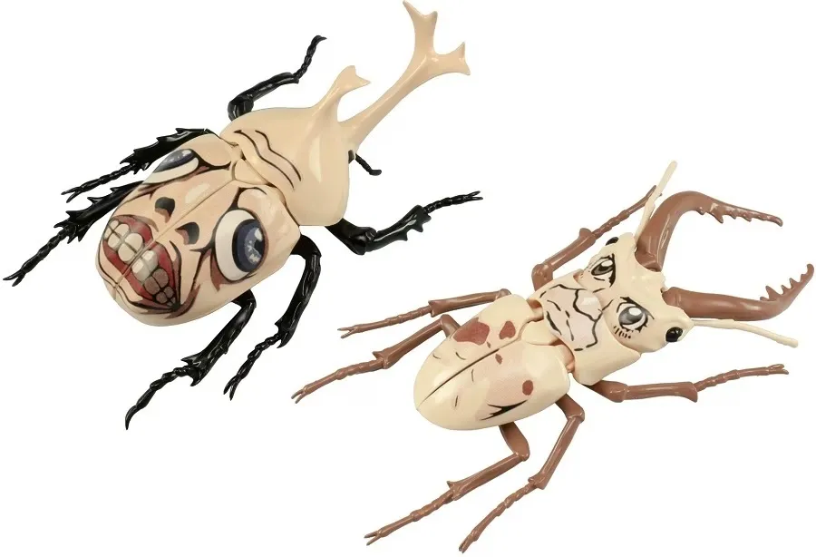 Fujimi's model kit of the helmet beetle and stag beetle is now available in colors evoking the Solid Titan from "Attack on Titan"! The Solid Titan's eerie faces are reproduced with stickers that are applied to the precision-molded and highly realistic models for a disturbing effect; each model kit assembles easily with no adhesive or tools required. The main parts such as the horns, legs, and chest are all movable so it can be displayed in a variety of poses, and the beetles can be displayed preparing for flight with parts replacement. You'll get parts to build one helmet beetle and one stag beetle.