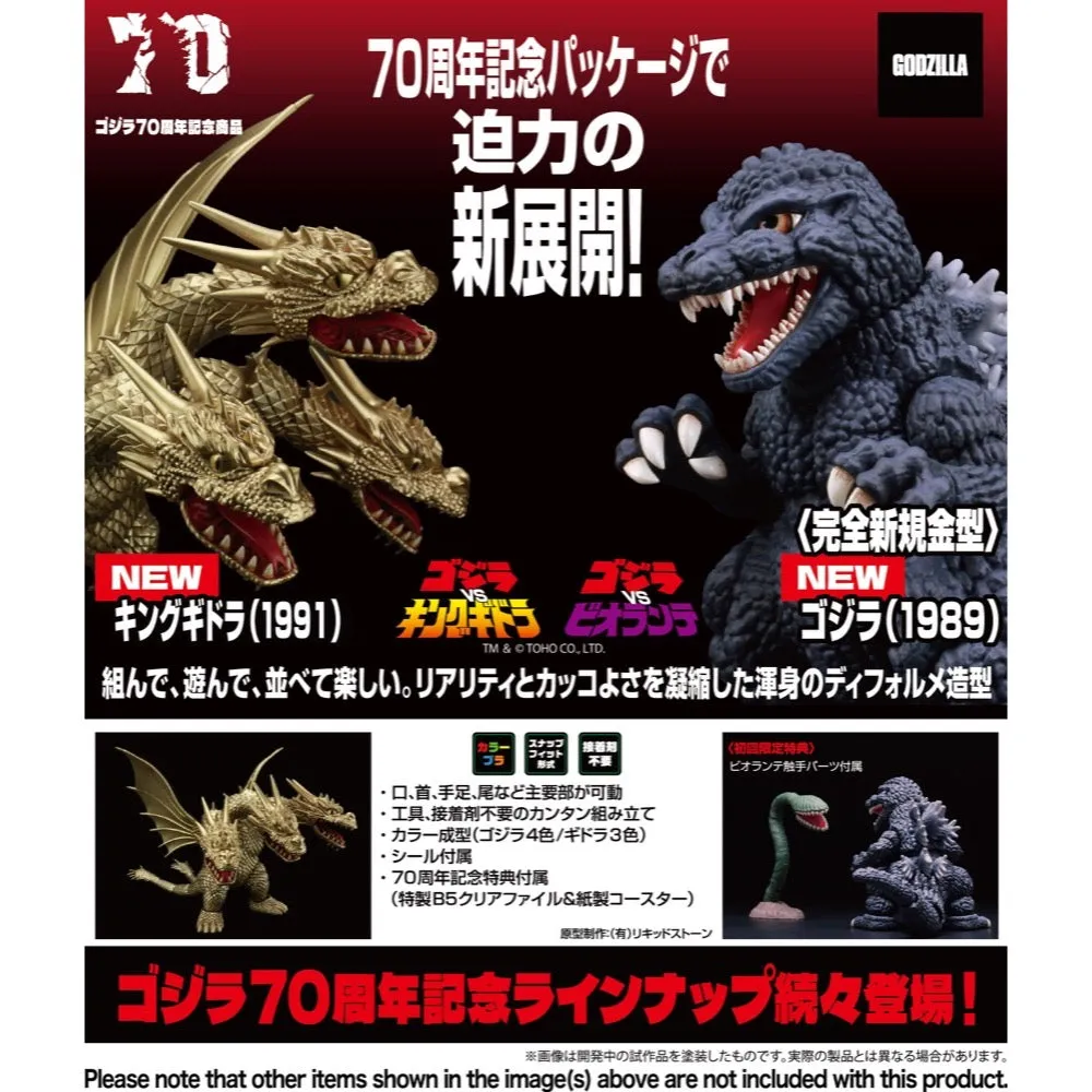 Celebrate the 70th anniversary of the mighty King Ghidorah with this model kit from Fujimi! Its slightly humorous style will look great in your collection, and it assembles easily without the need for tools or adhesives; it's molded in three colors. The neck, limbs and tail will be movable after assembly, and as a special 70th-anniversary bonus, a special B5-size (25cm x 17.6cm) clear file and paper coaster will be included!