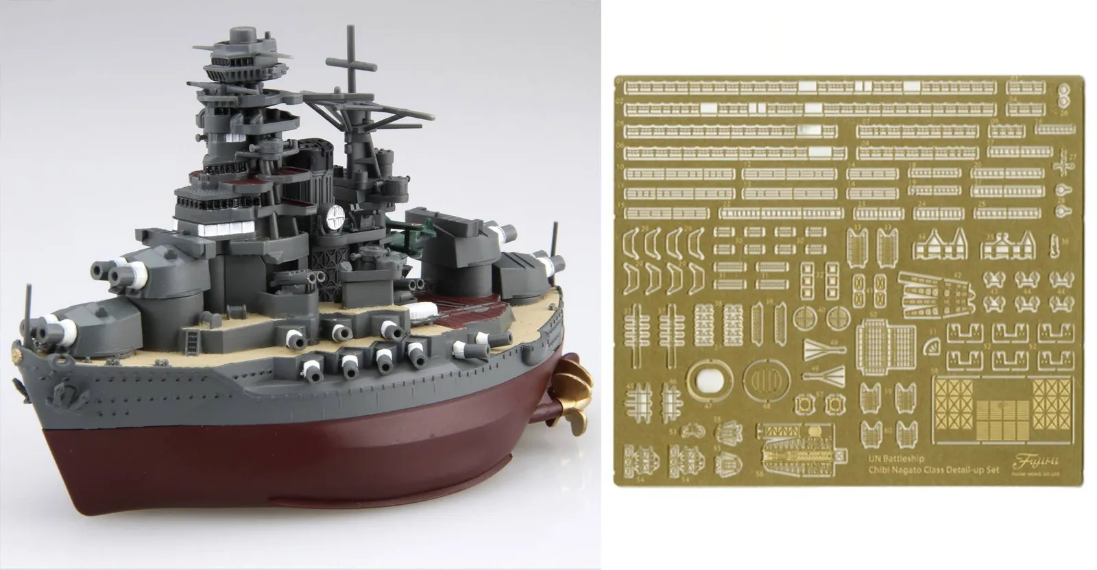 Description This is an injection-plastic ship model kit. The battleship Rikuoku joins Fujimi's Chibi-Maru Fleet lineup! This superdeformed ship model can be built as a waterline or full-hull version, and it snaps together for ease of assembly and is molded in color -- neither glue nor paint are needed! It also comes with special photo-etched parts for small parts such as the handrails, bridge window frames, directional antennas and wireless antenna columns. You'll love it -- order yours now! [Includes] : Photo-etched parts