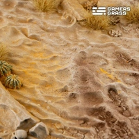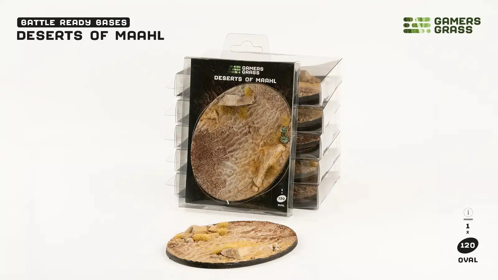 An accursed land, dry to the bone, where some resilient wildlife still thrives lurking in the sands (snakes, scorpions, lizards…). Amid desert rose crystals and the undying cacti the winds sweep the sands to form ridges, exposing crackled earths and clay. What remains of stray animals and explorers lays abandoned in the wastes, a chill and everlasting reminder of the perils of Maahl - “Consumer of hopes”, “Destroyer of dreams”. Will your miniatures embark on the quest for Desert’s End? Will they be able the cross this sundering hell between the lands? Can they find shelter for the nights? Ask yourself this… will you dare to venture into cursed Maahl!? Features: • This blister contains 1 thermoplastic 120mm wide oval Battle Ready Base, in a Deserts of Maahl theme. • The bottom slots are compatible with magnets sizing up to 6mm in diameter and 1mm thick. • All Battle Ready Bases are sold already painted and finished by hand. Please Note: Magnets are not included.