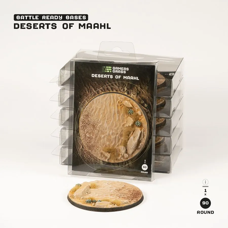This blister contains 1x90mm wide round Battle Ready Base, in a Deserts of Maahl theme.