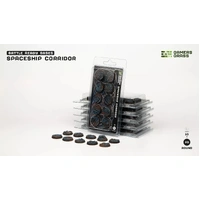 This blister contains 10 thermoplastic 25mm wide round Battle Ready Bases, in a Spaceship Corridor theme.