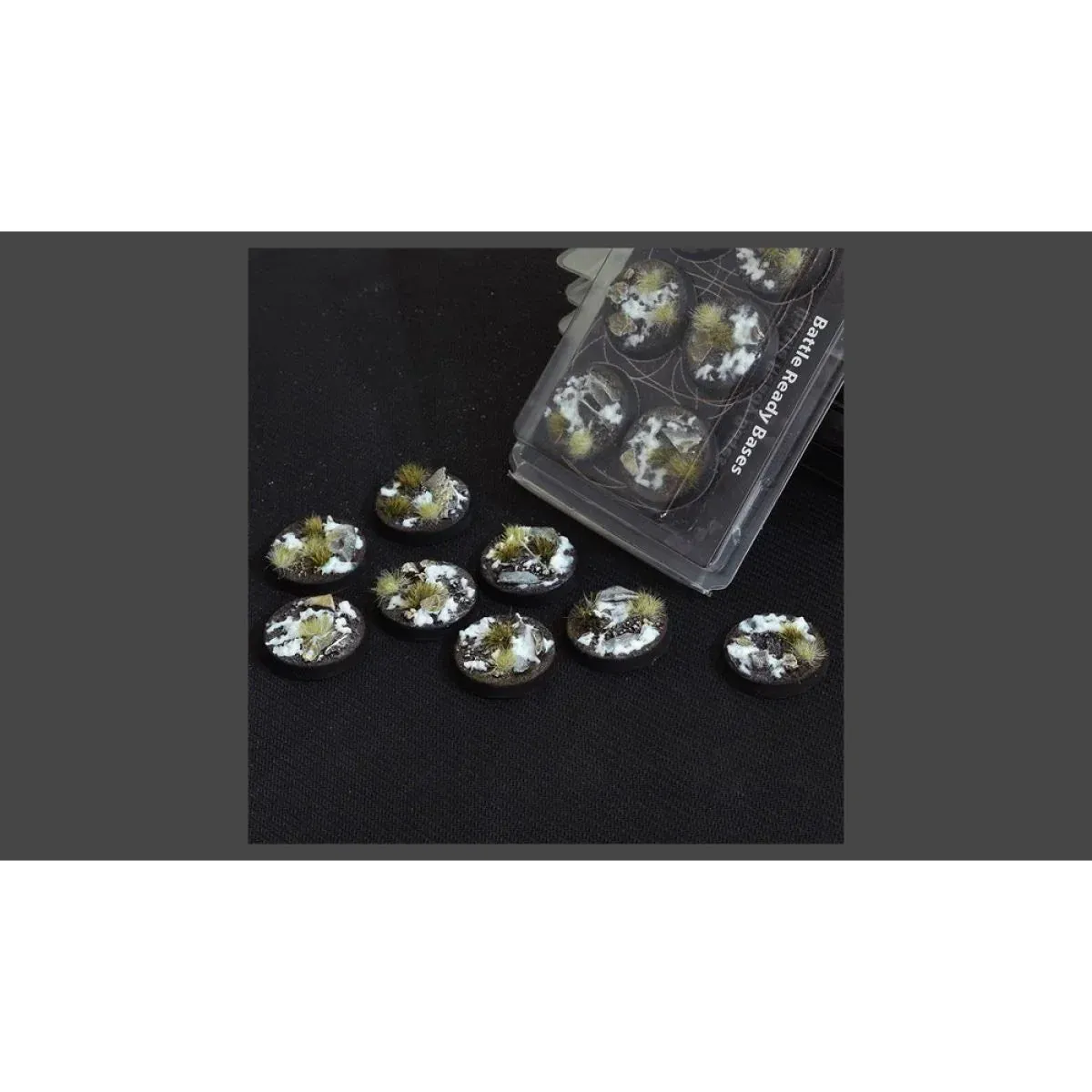 Cold rocky environments covered by partly melted snow and a few unsaturated tufts. These bases simulate with realism cold climates as well as winter/early-spring cold seasonal habitats with sparse vegetation. Features: • This pack contains 8 round Battle Ready Bases 32mm wide in a winter theme. • All Battle Ready Bases are already painted and finished by hand.