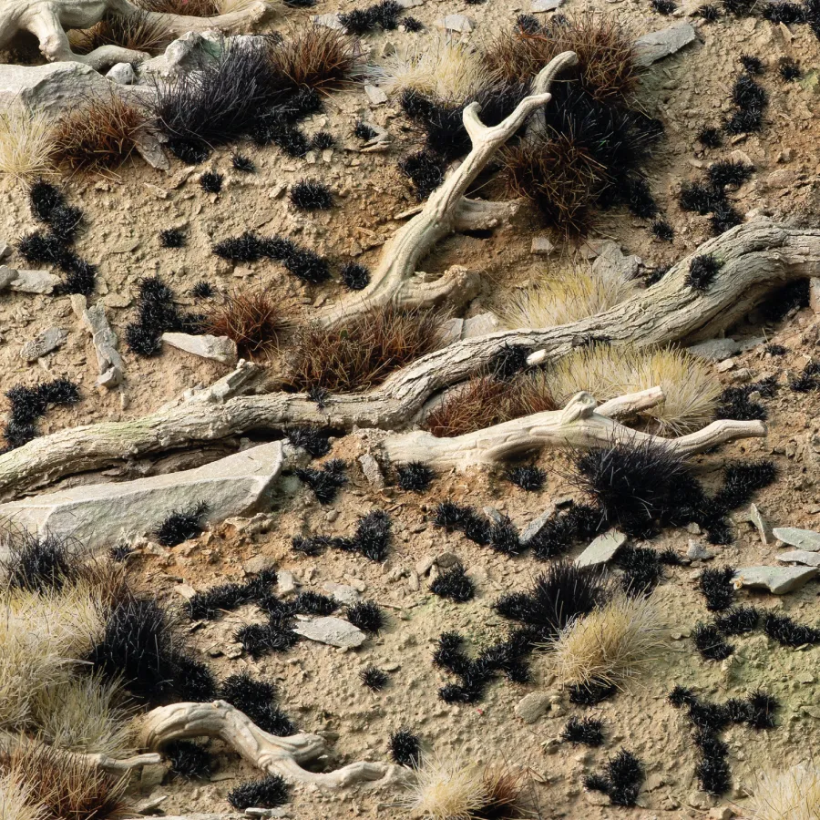 Very small and low tufts with black shades. Best used to simulate dark crustose lichens on rocks, bark, and shaded ground. In combination with other colours and textures, they provide realistic detail. At very small scales, they are perfect to recreate rugged, weathered surfaces.