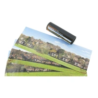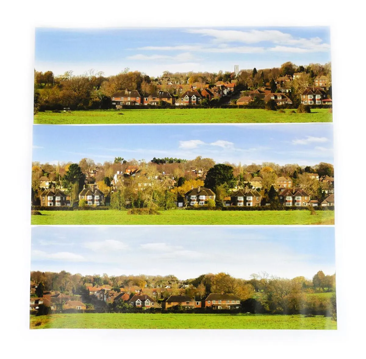 This SMALL backscenes measures 1372mm x 152mm and is ideal for N Gauge and the smaller scales. (3 Equally sized Sections Per Pack)This backscene features a typical English village/small town with houses climbing the pictured hill giving your scene extra perspective.