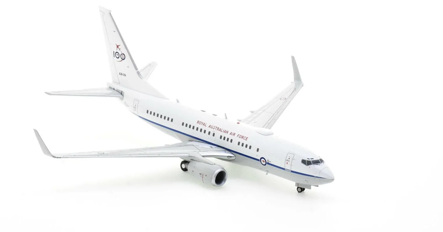 This is the Gemini Jets 1/200 Royal Australian Air Force B737-700S A36-001 RAAF 100 Years [G2RAA1224] Boeing 737 BBJ 1/200 Scale Diecast Model, No.34 Sqn, RAAF – G2RAA1224 Diecast model approximate dimensions: Length: 16.8 cm Wingspan: 17.2 cm Diecast model features: Constructed with metal and plastic components Undercarriage fixed extended Display stand not included. Gemini Jets G2RAA1224 Gemini200 Gemini Jets Gemini200 series G2RAA1224 replicates in 1/200 scale diecast the B737-7DF BBJ (-DF is Boeing’s customer code for RAAF), serial number A36-001 with the RAAF’s “100 Years” anniversary tail logo. The aircraft is assigned to No.34 Squadron, Royal Australian Air Force (RAAF). RAAF “100 Years” With the 100th anniversary of the RAAF on March 31, 2021, almost every aircraft type received a commemorative tail logo. A36-001 was the only 737 BBJ to wear the “100 Years” logo.
