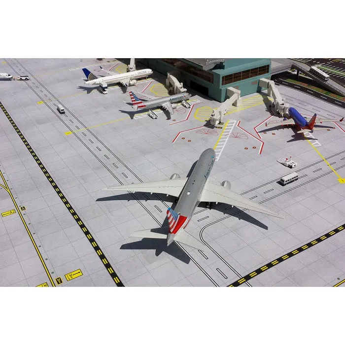 This terminal (GJARPTB) and mat (GJAPS006, sold separately) features a more complete airport display including an airside area featuring 5 narrowbody gates, 2 widebody gates, and regional jet parking ramp parking. Additional features include a full-scale multi-level arrivals and departures landside area with elevated roadway and car park. Surrounding the car park area is a full service airport access roadway system. Dimensions of this assembly are approximately 39¼ x 54½ inches.