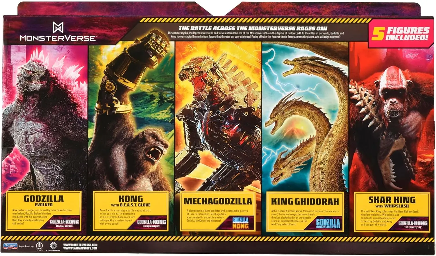 The "GxK 2 TNE: 6" Titans vs Titans 5 Pack" is a set of five 6-inch action figures from the Godzilla x Kong which includes Godzilla Evolved, Kong, Skar King, Shimo, and Mothra with Jia. These highly detailed and articulated figures are designed for play and display, coming with movie-inspired accessories and packaged in vibrant packaging featuring the Hollow Earth theme.