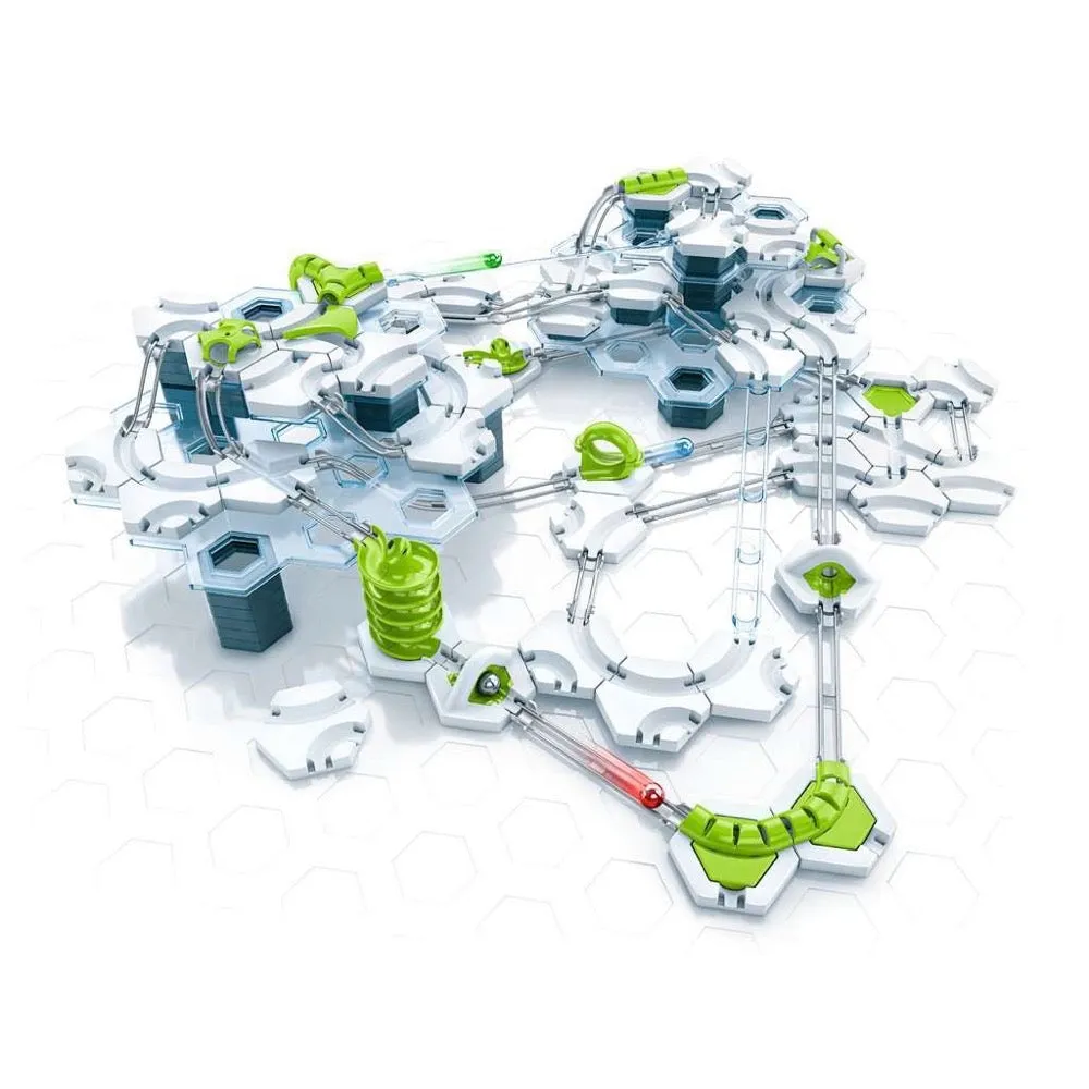 This construction set features all the components from the GraviTrax Starter Set, elements from the Bridges and Tunnels expansions, plus 4 additional accessories, including the Magnetic Cannon, Flip, Loop and Spiral.