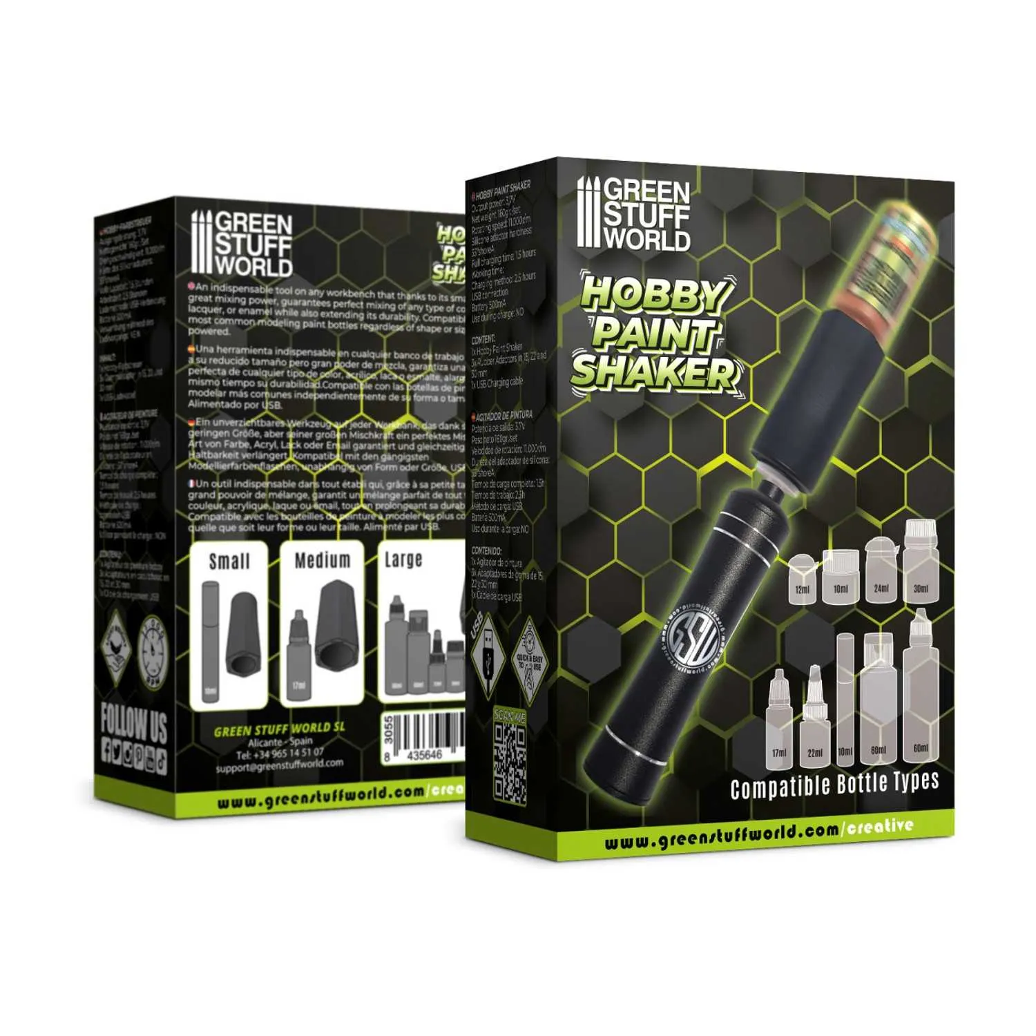 The device is used to shake color bottles and mix the components inside so that paints are homogeneous and ready for use. It works with a wide variety of colors (acrylic, lacquer, enamel, oil, latex) regardless of its bottling, as it has three different heads to adapt to any bottle.