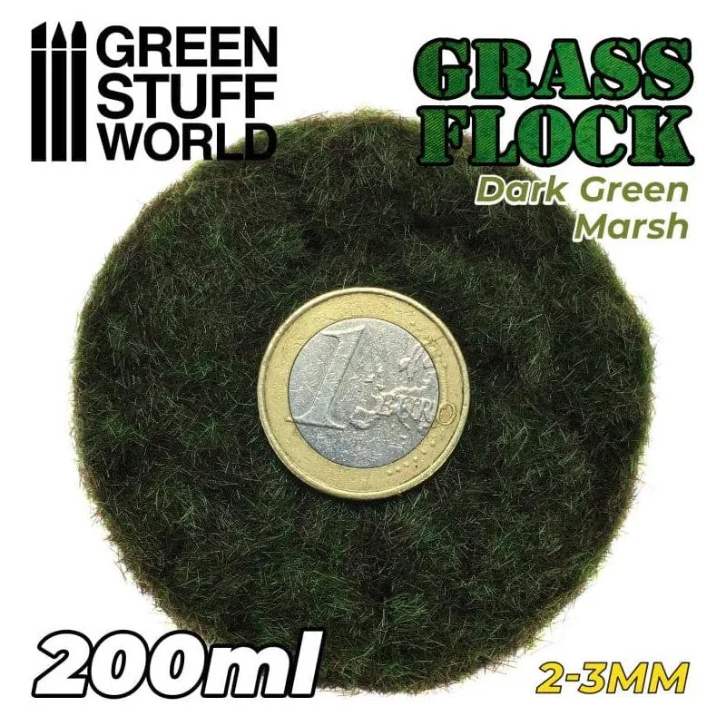 GREEN STUFF WORLD FLOCK 2-3MM 200ML - DARK GREEN MARSH Static Grass Green Stuff World's static grass is realistic and of high quality. Designed to decorate the bases of your miniatures or for scenography and terrain building . It is recommended to apply with white glue. The static grass flock is packaged in closed plastic boxes of great capacity to facilitate their use. This amount will allow you to easily decorate one or more armies and create dozens of sets and bases . Content: 200 ml