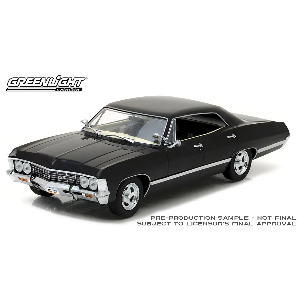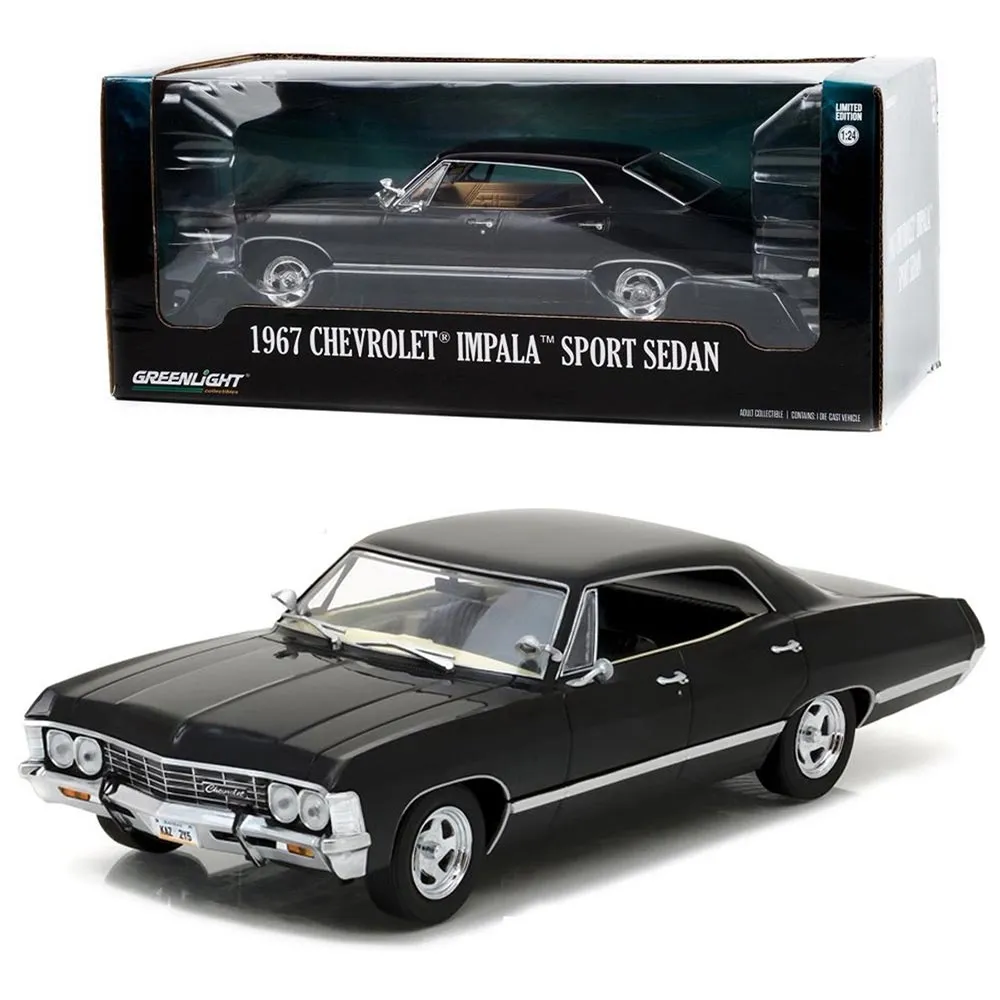1:24 scale model of 1967 Chevrolet Impala Sport Sedan Tuxedo Black Opening doors, bonnet and boot Real rubber tyres Detailed interior and exterior Die cast vehicle from Greenlight
