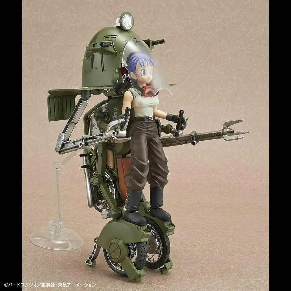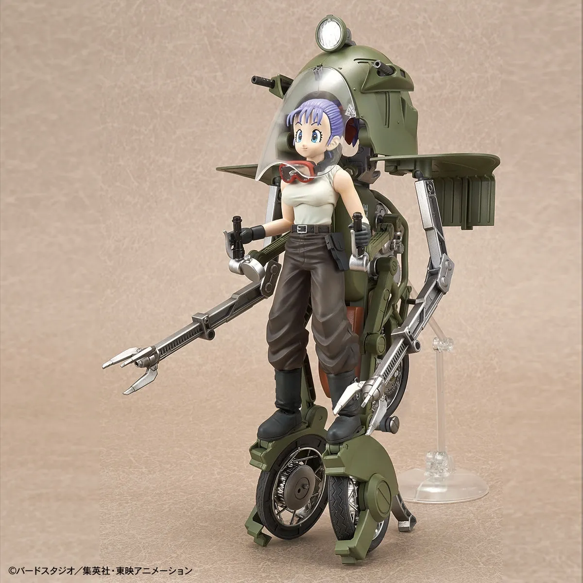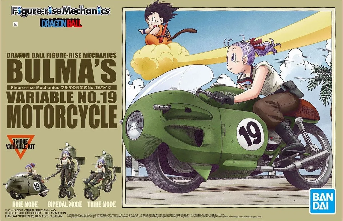 Bandai - Figure-rise Mechanics Bulma’s Variable No.19 Motorcycle Bulma 's motorcycle that appeared in the door painting of the cartoon "Dragon Ball" is three-dimensional! An amazing vehicle used by Bulma to search for the Dragon Balls! The Dragon Ball Z Bulma's Variable No.19 Bike Figure-rise Mechanics Model Kit includes transforming abilities that allow it to change between motorcycle into a bi-pedal and trike mode. The model kit also includes a Bulma figure that has different hand and leg parts to allow her to pilot the controls for each mode and display base.