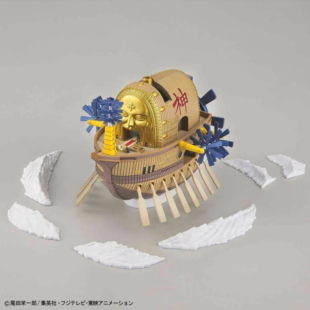 The first flying ship from "One Piece" gets a new model kit from Bandai! Enel's colossal Ark Maxim features independently rotating propellers and a glossy finish on its characteristic golden face. It also comes with display parts to show it off floating in the sky, and white cloud effect parts too!