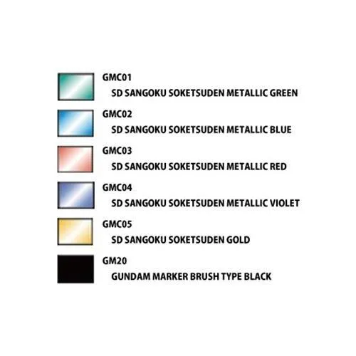 SKU: GNGMS100C | Brand: Gunze Mr Hobby | Product: Gunze Gundam Sangoku Soketsuden Marker Set This marker set includes metallic paint colors corresponding to character designs from SD GUNDAM WORLD SANGOKU SOKETSUDEN models. The metallic formulation provides chromatic finish options for detailed work on the SD Gundam series lineup.