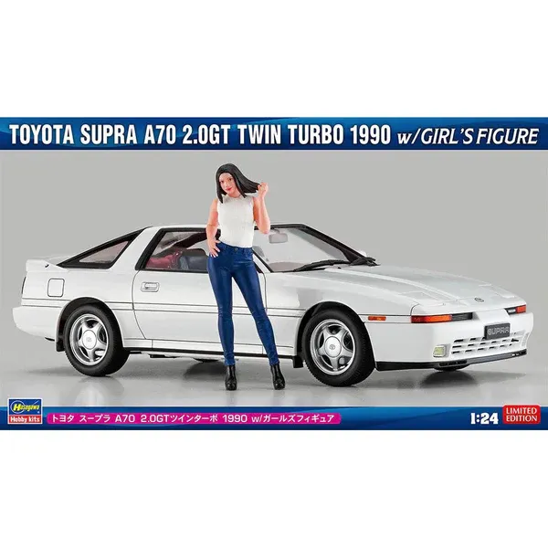 1/24 Toyota Supra A70 2.0 GT Twin Turbo 1990 with Girl's Figure by Hasegawa lets you build a nostalgic scene, capturing the spirit of 90s Japanese car culture with this iconic Supra and its accompanying figure!