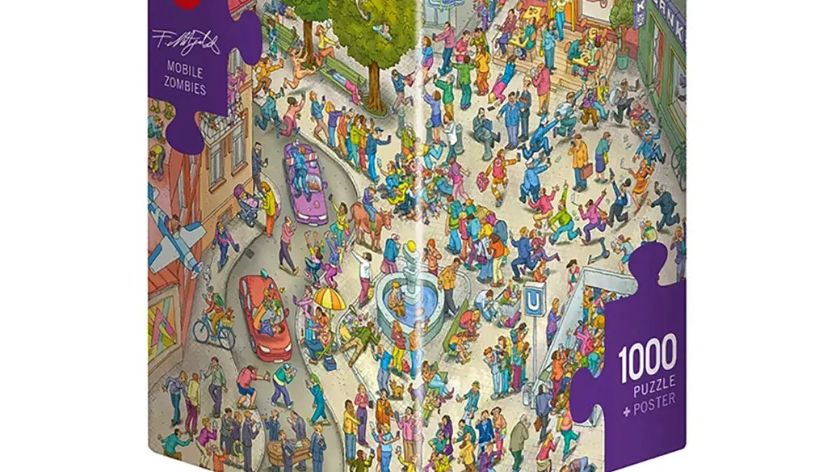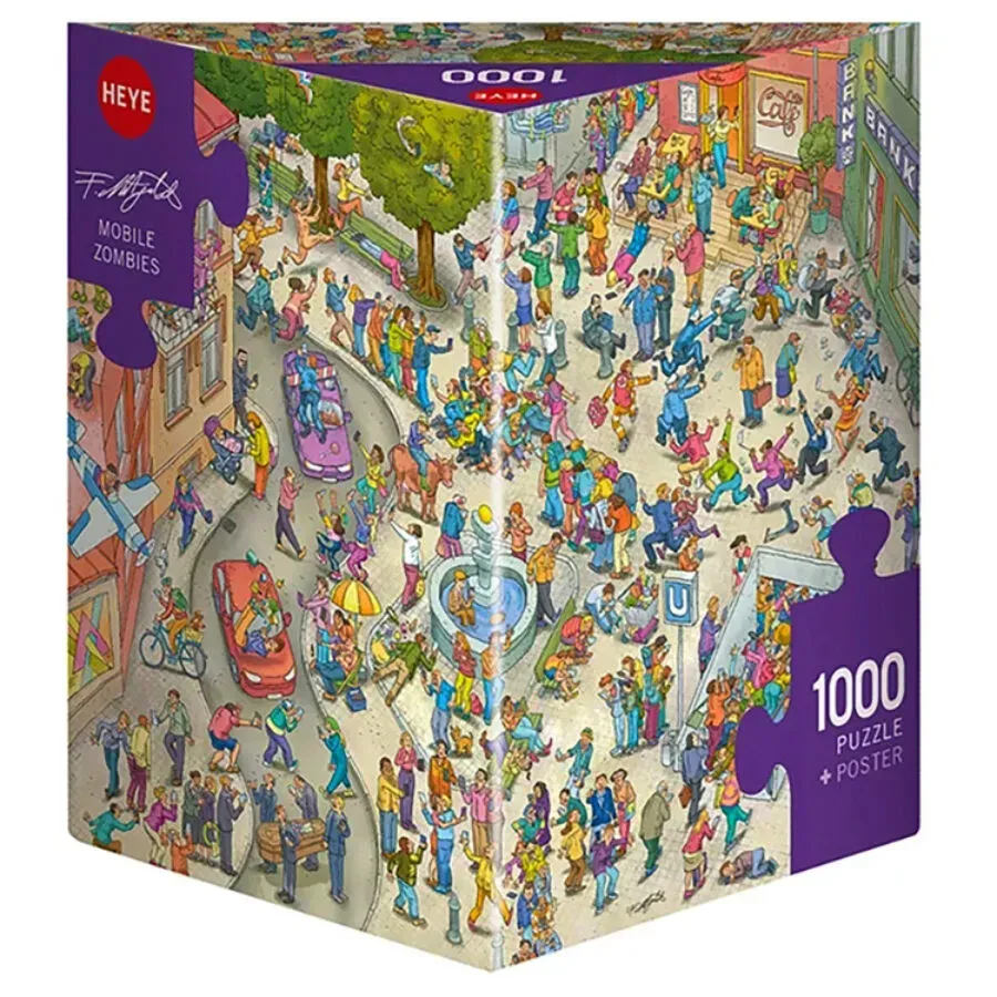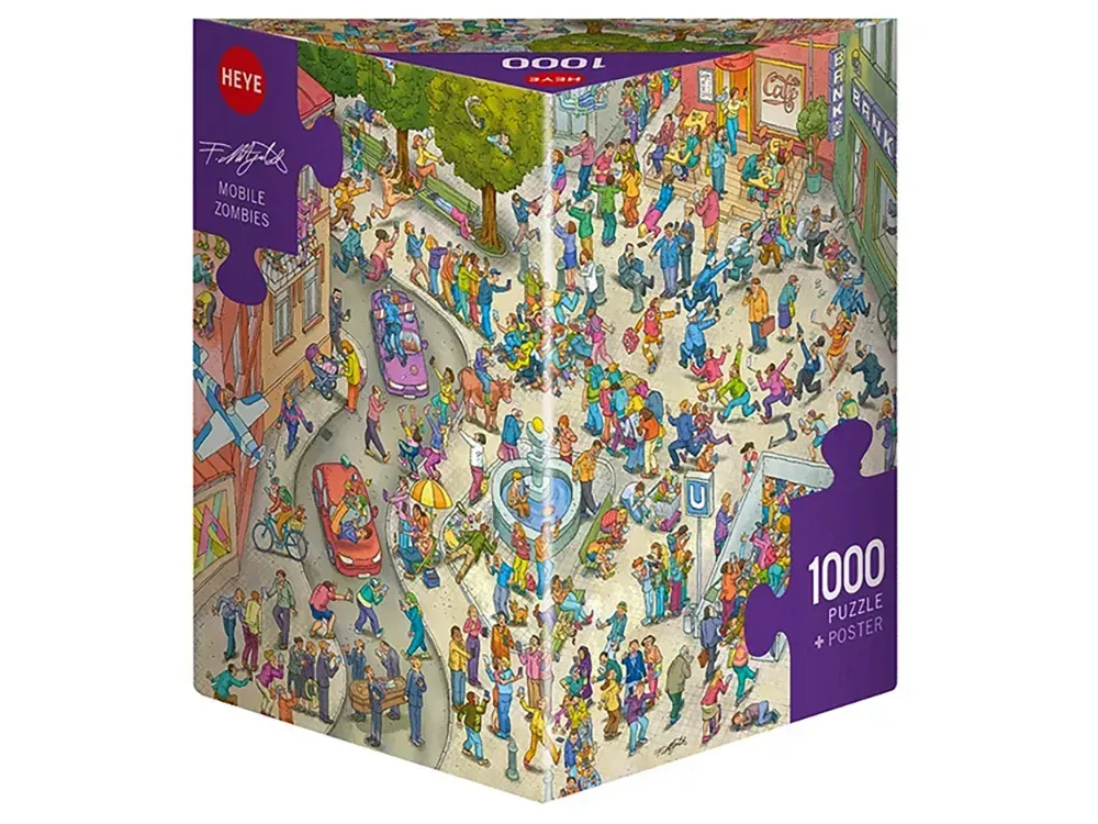 Heye Mobile Zombies 1000 Piece Jigsaw Puzzle in a triangular shaped box. Puzzle measures 70.0 x 50.0 cm. Buy online Australia