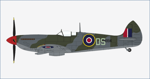 The Mk. IX replaced the Mk. V in June 1942 and on September 12, 1942 a Mk. IX brought down a Ju-86R flying at 43,000 feet. Another major achievement of the Mk. IX took place on October 5, 1944 when 401 Squadron became the first allied aircraft to shoot down an Me-262 jet. Even with the arrival of the Griffon powered Mk. XIV the Mk. IX continued in service until the end of WWII. There were 5,665 Mk. IX Spitfires and its variants produced.