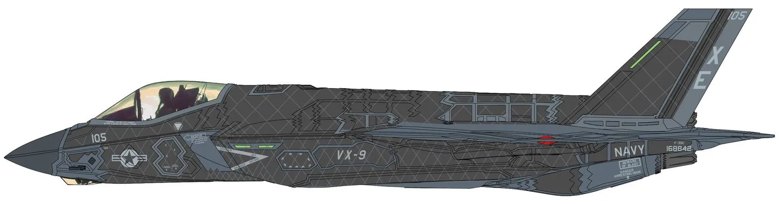 The F-35A CTOL (Conventional Take Off and Landing) and has four internal weapons stations in two weapons bays plus three optional external weapons stations.