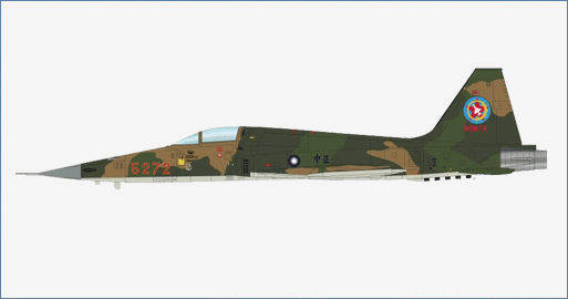 In 1982 the 44th, 45th and 46th FS formed the 7th FG of the 737th FW. In 1984 the wing converted from the F-5A/B to the F-5E/F and the 46th became a independent TFS reporting directly to the 737th TFW and tasked as an Aggressor Squadron. The 46th TFS F-5Es were painted with large red buzz numbers on the nose and the stenciled “Chung Chen” on the side of the fuselage. In 1988 ROCAF installed its Tactical Aircrew Combat Training System/Air Combat Maneuvering Instrumentation (TACTS/ACMI) training range at Taitung AFB with the 46th TFS as its sole unit. ROCAF Northrop F-5E buzz number 5272 was built as c/n VE.1024 serial number 78-00874.