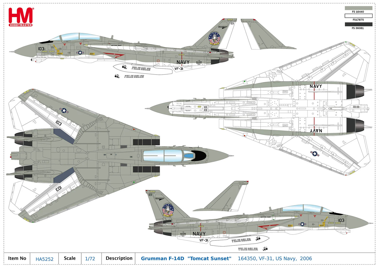 Hobby Master 1/72  Grumman F-14D "Tomcat Sunset" 164350 VF-31 US Navy 2006 Diecast Model Aircraft