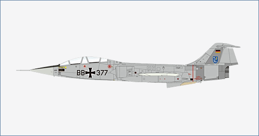 Built in 1960 by Lockheed as F-104F c/n 283-5064 it was a dedicated training aircraft without offensive weapons or radar. Originally given the code BB+377 and assigned to the WaSLw10 Luftwaffe in 1967 the codes were revised and BB+377 became 29+13. On March 6, 1970 this aircraft was written off while doing practice touch-and-goes at Jevers AB. Apparently after one of the landings the pilot retracted the landing gear too soon and the aircraft did a belly landing destroying the aircraft both occupants were unhurt.