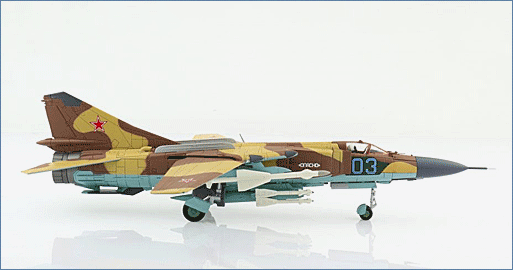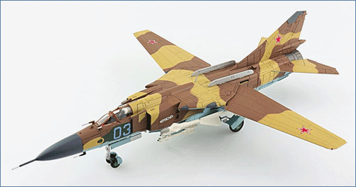 In the 1960’s the Soviet military required a replacement for the MiG-21 that could compete with the USAF F-14 Tomcat. It had to be very fast, rapid acceleration, carry a larger payload, capable of a high service ceiling, long range and beyond visual range intercept capabilities. The project was given to the Mikoyan- Gurevich Design Bureau that produced the Model 23-11 that first flew on June 10, 1967. Production began in 1969 and eventually completed over 5,000 swing-wing MiG-23s. A ground-attack variant was also produced, the MiG-27.