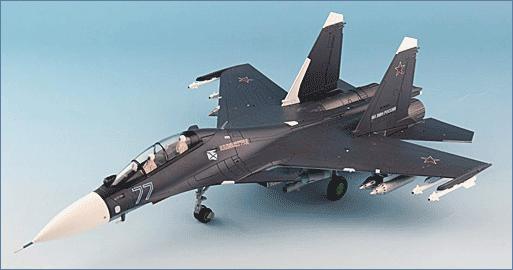 The Sukhoi Su-30, initially named Su-27PU, is a two-seat multi-role fighter that evolved from the Su-27UB trainer version. The Su-30 was given new avionics and weapons for ground attack abilities. The aircraft began production in 1992 and in 1996 was renamed Su-30, NATO name is Flanker. The Su-30 has several variants, India has the MKI, Algeria has the MKA and Malaysia the MKM and Russia the SM. These 4 variants all have thrust vectoring and canards for added stability to compensate for the nose-heavy radars. There are several other Su-30 variants without canards.