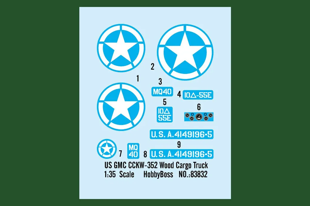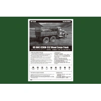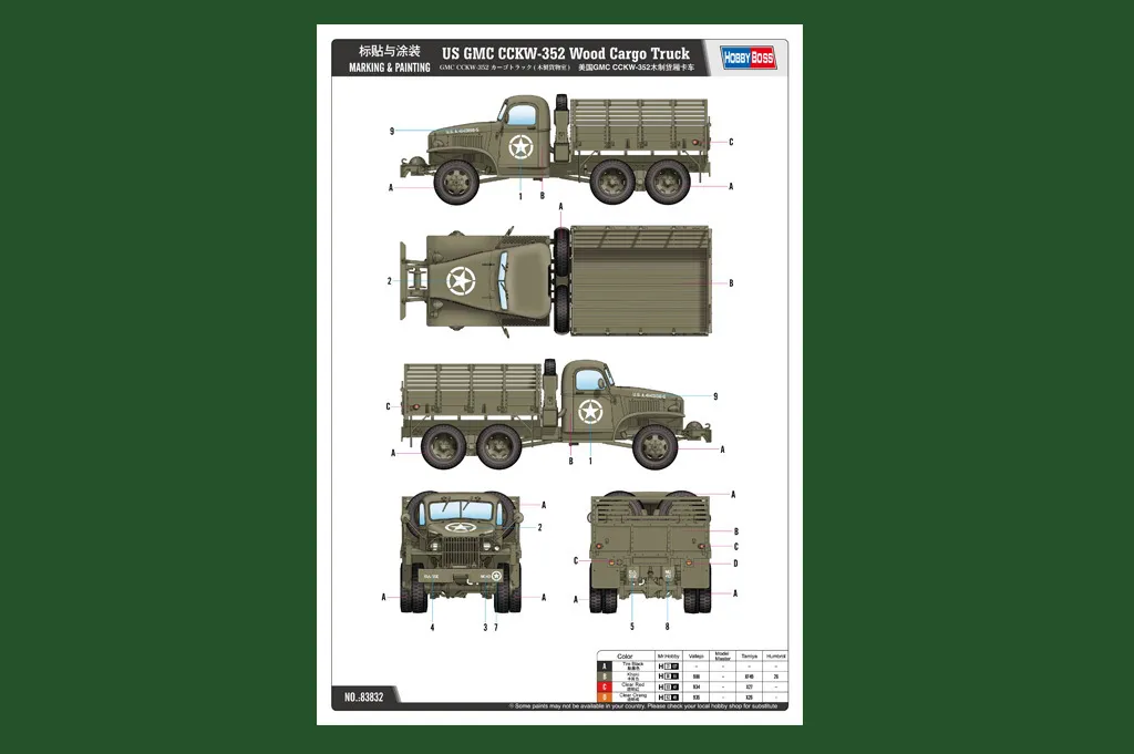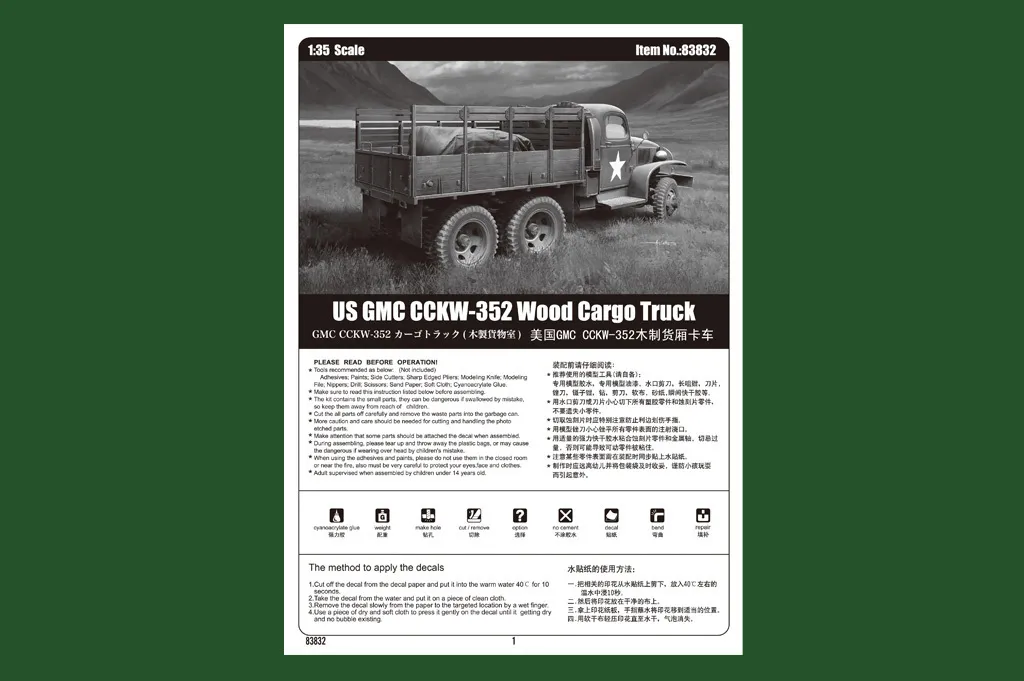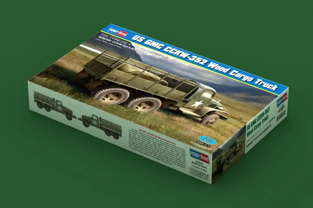 Item No 83832 Item Name US GMC CCKW-352 Wood Cargo Truck Bar Code 6939319238320 Scale 1:35 Item Type Static kit Model Dimension Length: 180mm Width:63.8 mm Total Plastic Parts 320+ Total Sprues 13 sprues and cab Chromeplate Parts n/a Resin Parts n/a Metal Parts brass wire Photo Etched Parts 1 piece Film Accessory n/a Released Date 2015-07 More Features The kit consists of over 320 parts , includes 11 clear parts - Details finely represented by newly tooled parts - Main tires with very good detail - Photo-etched parts included