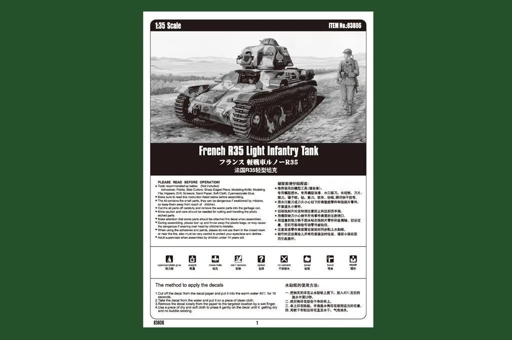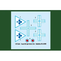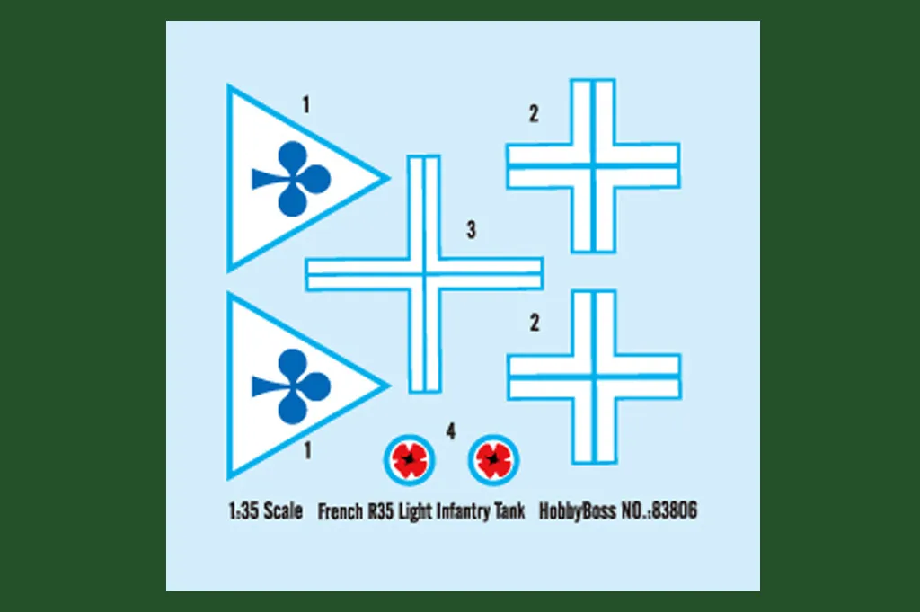 Item No 83806 Item Name French R35 Light Infantry Tank Bar Code 6939319238061 Scale 1:35 Item Type Static kit Model Dimension Length:120mm Width:55.3 mm Total Plastic Parts 420+ Total Sprues 8 sprues and hull Chromeplate Parts n/a Resin Parts n/a Metal Parts n/a Photo Etched Parts 1 piece Film Accessory n/a Released Date 2014-01 More Features the kit consists of over 420 parts - multi-directional slide molded lower hull w/fine detail - photo-etched parts included