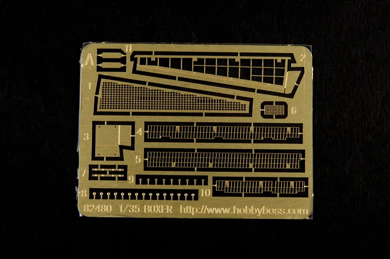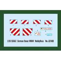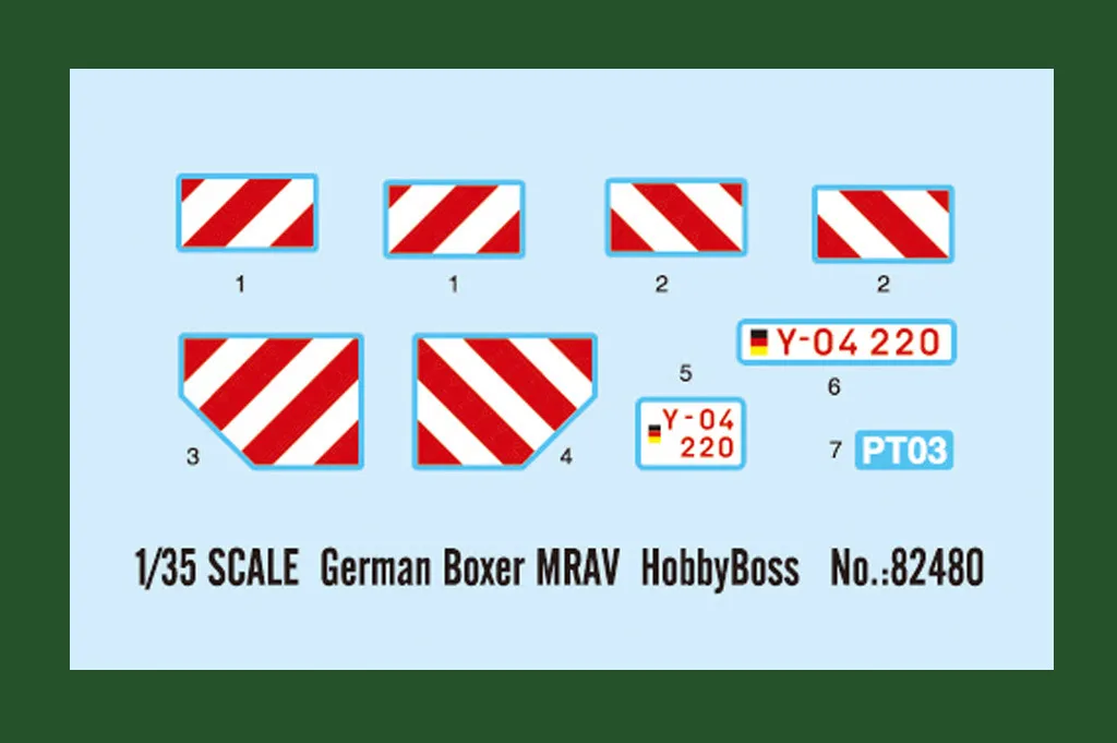 Item No 82480 Item Name German Boxer MRAV Bar Code 6939319224804 Scale 1:35 Item Type Static kit Model Dimension Length: 286mm Width: 95mm Total Plastic Parts 450+pcs Total Sprues 13 sprues, upper hull,lower hull ,poly caps and 8 tyres Chromeplate Parts n/a Camouflage Scheme German Boxer MRAV Resin Parts n/a Metal Parts n/a Photo Etched Parts 1piece Film Accessory n/a Released Date 2011-03 More Features - Two-directional slide moulded lower hull and upper hull - The crew entry door can be fixed in the open or closed position. - The photo-etched fret includes mesh cover parts - Grooved rubber tires