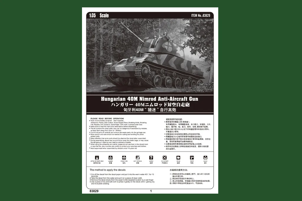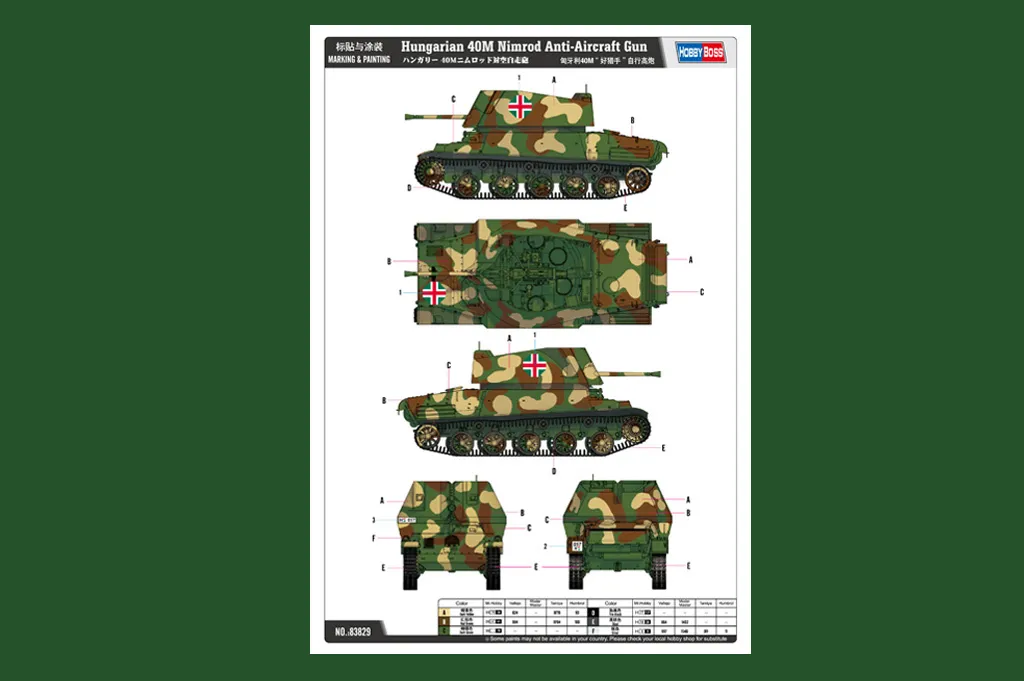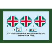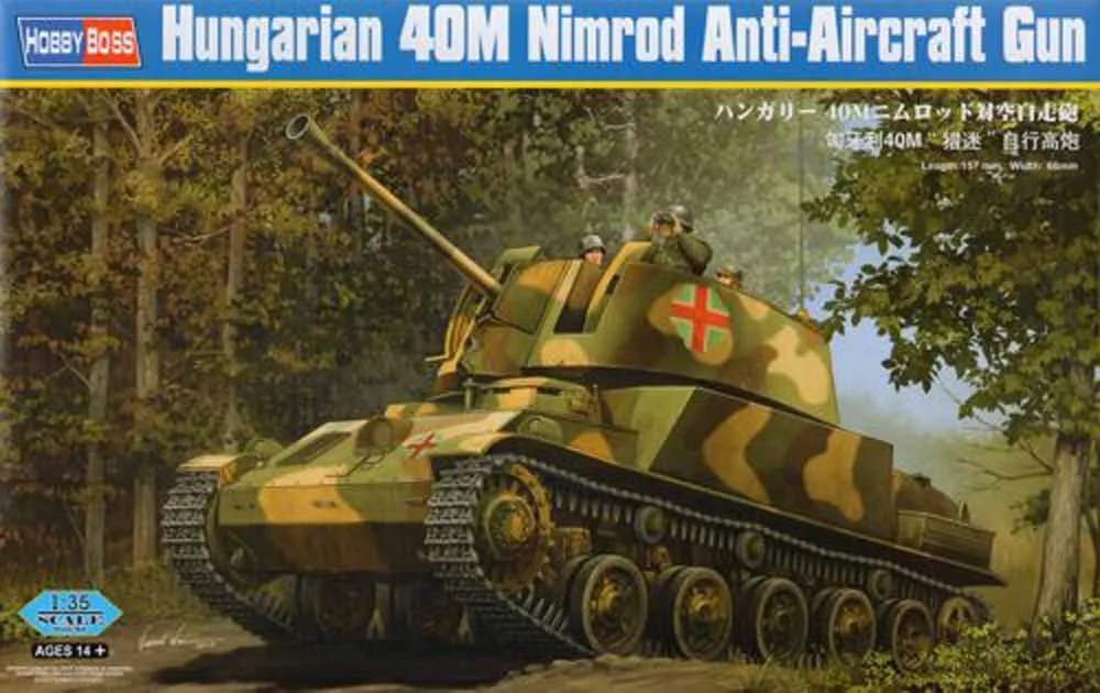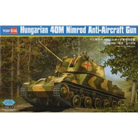 The vehicles' only armament was a 36M 40 mm Bofors anti-aircraft gun also mad license. e in Hungary under Item No 83829 Item Name Hungarian 40M Nimrod Anti-Aircraft Gun Bar Code 6939319238290 Scale 1:35 Item Type Static Kit Model Dimension Length: 157mm   Width: 66mm Total Plastic Parts 710+ Total Sprues 20 sprues , upper hull and lower hull Chromeplate Parts n/a Resin Parts n/a Metal Parts n/a Photo Etched Parts 1 piece Film Accessory n/a Released Date 2013-09 More Features the kit consists of over 700 parts -  multi-directional slide molded lower hull & upper hull w/fine detail - photo-etched parts included