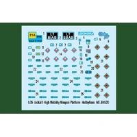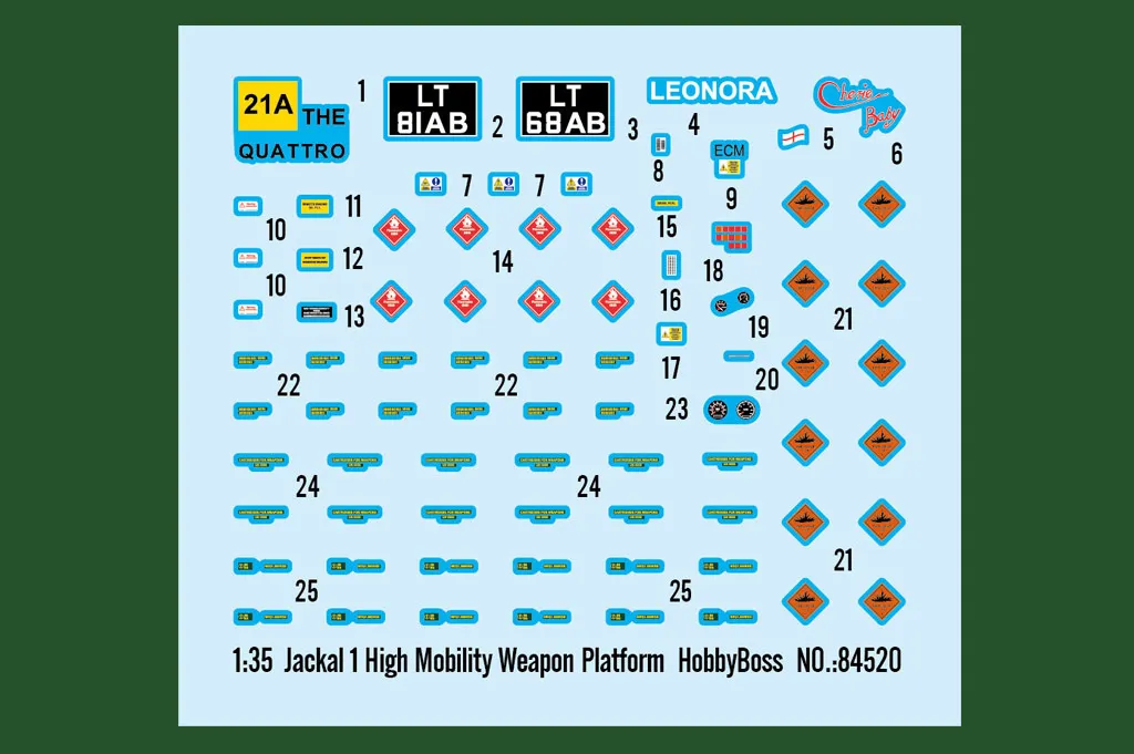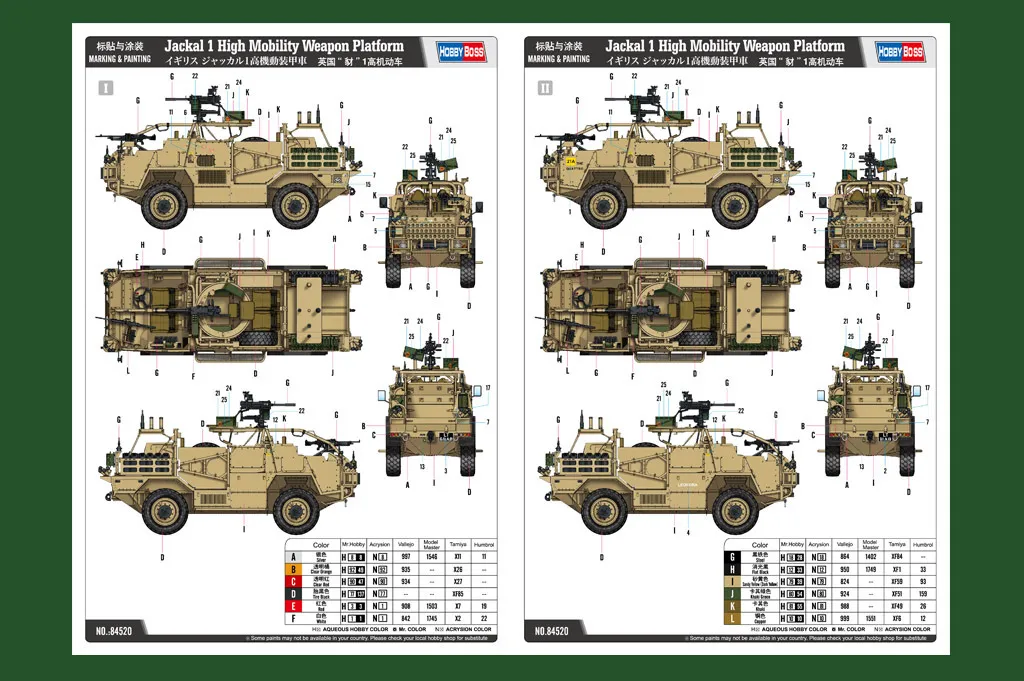 • a light armoured support vehicle to support the new Jackal 2. Item No 84520 Item Name Jackal 1 High Mobility Weapon Platform Bar Code 6939319245205 Scale 1:35 Item Type Plastic Model Armor Kit Model Dimension Length: 171.5mm   Width: 68.5mm Total Plastic Parts 800+ Total Sprues 14 sprues , upper hull , lower hull and tires Chromeplate Parts n/a Resin Parts n/a Metal Parts n/a Photo Etched Parts 6 pcs Film Accessory n/a Released Date 2020-11 More Features The kit consists of over 800 parts >the kit w/refined detail >multi-slide moulded upper hull and lower hull >photo etched parts included >rubber tires