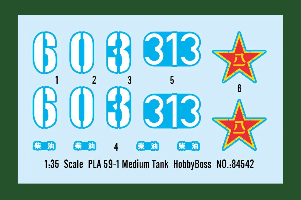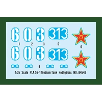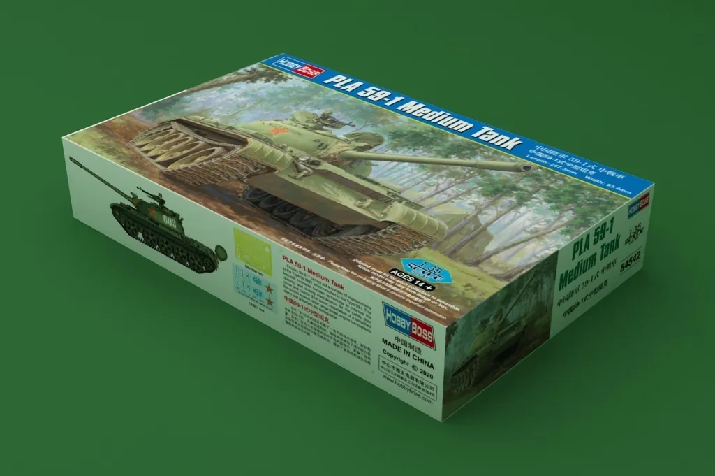 Item No 84542 Item Name PLA 59-1 Medium Tank Bar Code 6939319245427 Scale 1:35 Item Type Plastic Model Armor Kit Model Dimension Length: 257.3mm   Width: 93.4mm Total Plastic Parts 520+ Total Sprues 16 sprues , lower hull , upper hull and turret Chromeplate Parts n/a Resin Parts n/a Metal Parts copper cable Photo Etched Parts 1 piece Film Accessory n/a Released Date 2020-08 More Features The kit consists of over 520 parts >the kit w/refined detail >multi-slide moulded lower hull , turret >individual tracks >photo etched parts included