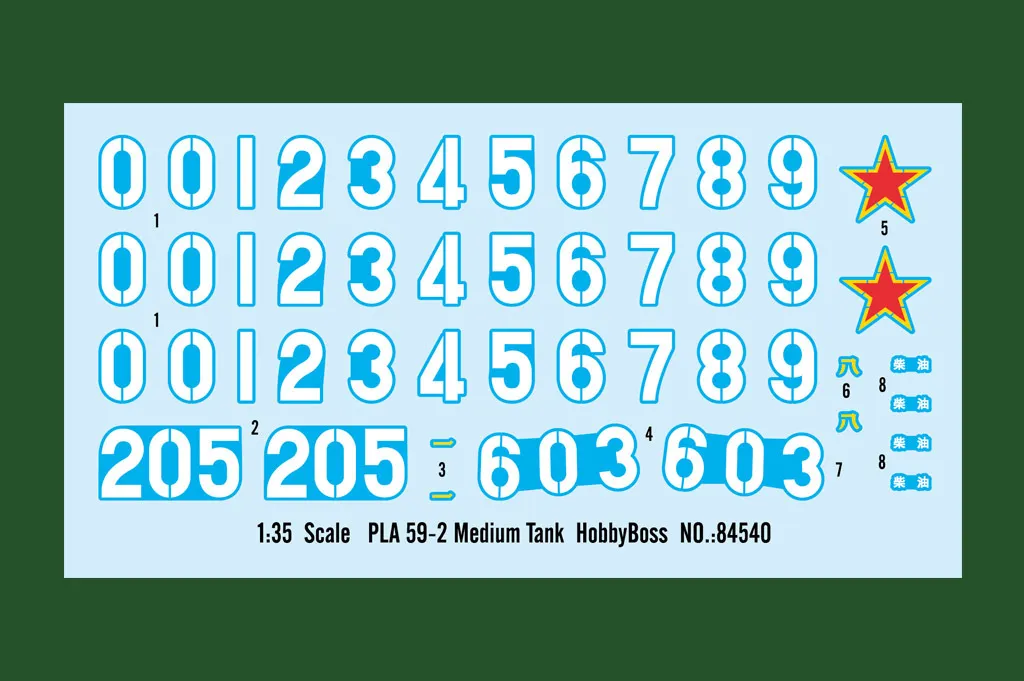 PLA 59-2 Medium Tank Item No 84540 Item Name PLA 59-2 Medium Tank Bar Code 6939319245403 Scale 1:35 Item Type Plastic Model Armor Kit Model Dimension Length: 257.3mm   Width: 93.4mm Total Plastic Parts 540+ Total Sprues 15 sprues , lower hull , upper hull and turret Chromeplate Parts n/a Resin Parts n/a Metal Parts copper cable Photo Etched Parts 1 piece Film Accessory n/a Released Date 2022-08 More Features The kit consists of over 540 parts >the kit w/refined detail >multi-slide moulded lower hull , turret >individual tracks >photo etched parts included