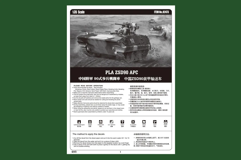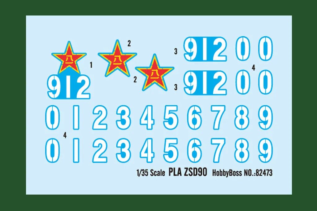 Item No 82473 Item Name PLA ZSD90 APC Bar Code 6939319224736 Scale 1:35 Item Type Static kit Model Dimension Length: 189mm Width:91 mm Total Plastic Parts 440+ Total Sprues 5 sprues , lower hull , upper hull and tracks Camouflage Scheme PLA Metal Parts cable Photo Etched Parts 1 piece Released Date 2012-07 More Features the kit consists of over 440 parts - Two-directional slide moulded lower hull and upper hull - The crew entry door can be fixed in the open or closed position. - The photo-etched fret includes mesh for the engine grill - 160 individual tracks links