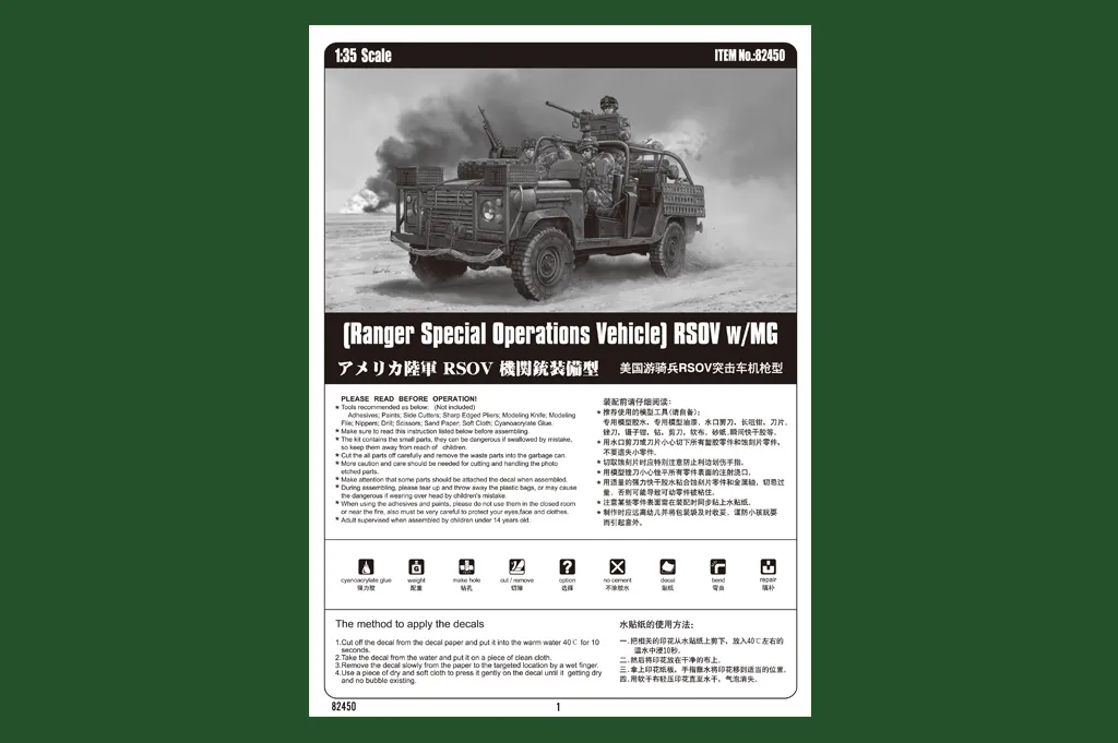 Item No 82450 Item Name (Ranger Special Operations Vehicle) RSOV w/MG Bar Code 6939319224507 Scale 1:35 Item Type Static kit Model Dimension Length: 134.6mm Width: 55.4mm Total Plastic Parts 190+ Total Sprues 9 sprues and tires Photo Etched Parts 1piece Released Date 2012-06 More Features The kit consists of over 190 parts ,includes 10 clear parts. -the kit w/refined detail -Detailed engine w/accurate design -Rubber tires with very good detail